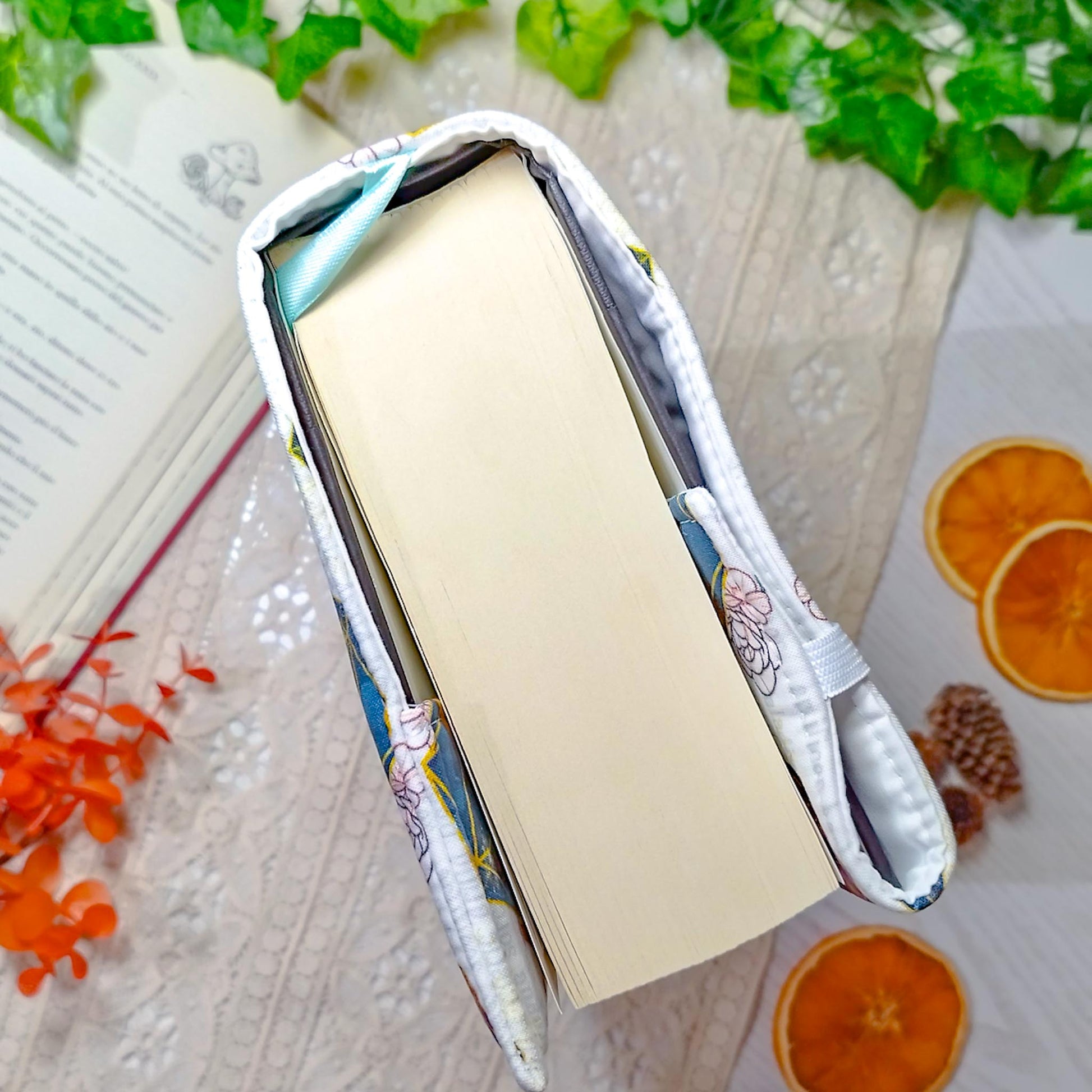 La parte destra della custodia è aperta e avvolge la copertina del libro per adattarsi al numero di pagine. Ribaltando l'elastico al di fuori della copertina, la custodia si mantiene salda al libro anche mentre leggi.
