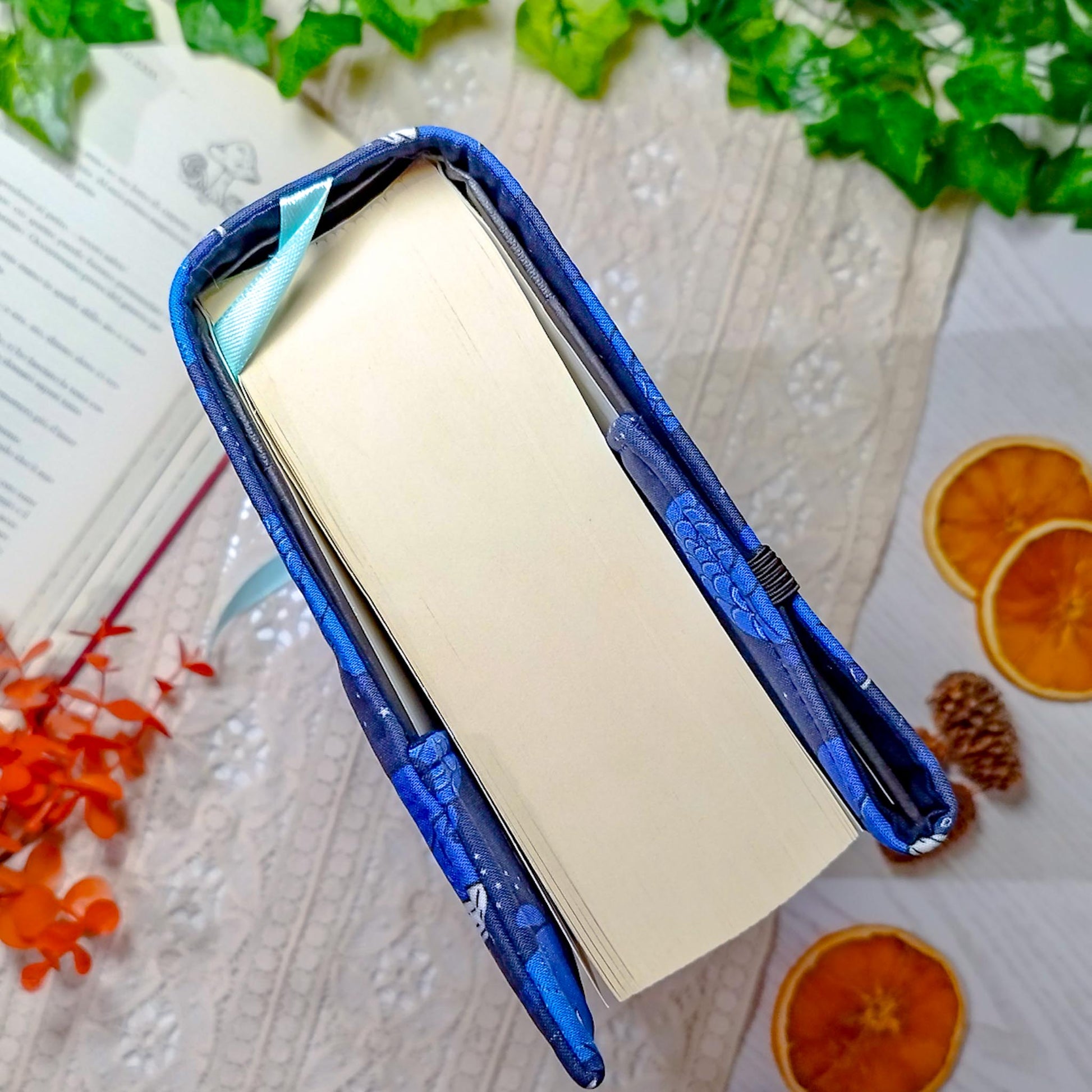 La parte destra della custodia è aperta e avvolge la copertina del libro per adattarsi al numero di pagine. Ribaltando l'elastico al di fuori della copertina, la custodia si mantiene salda al libro anche mentre leggi.