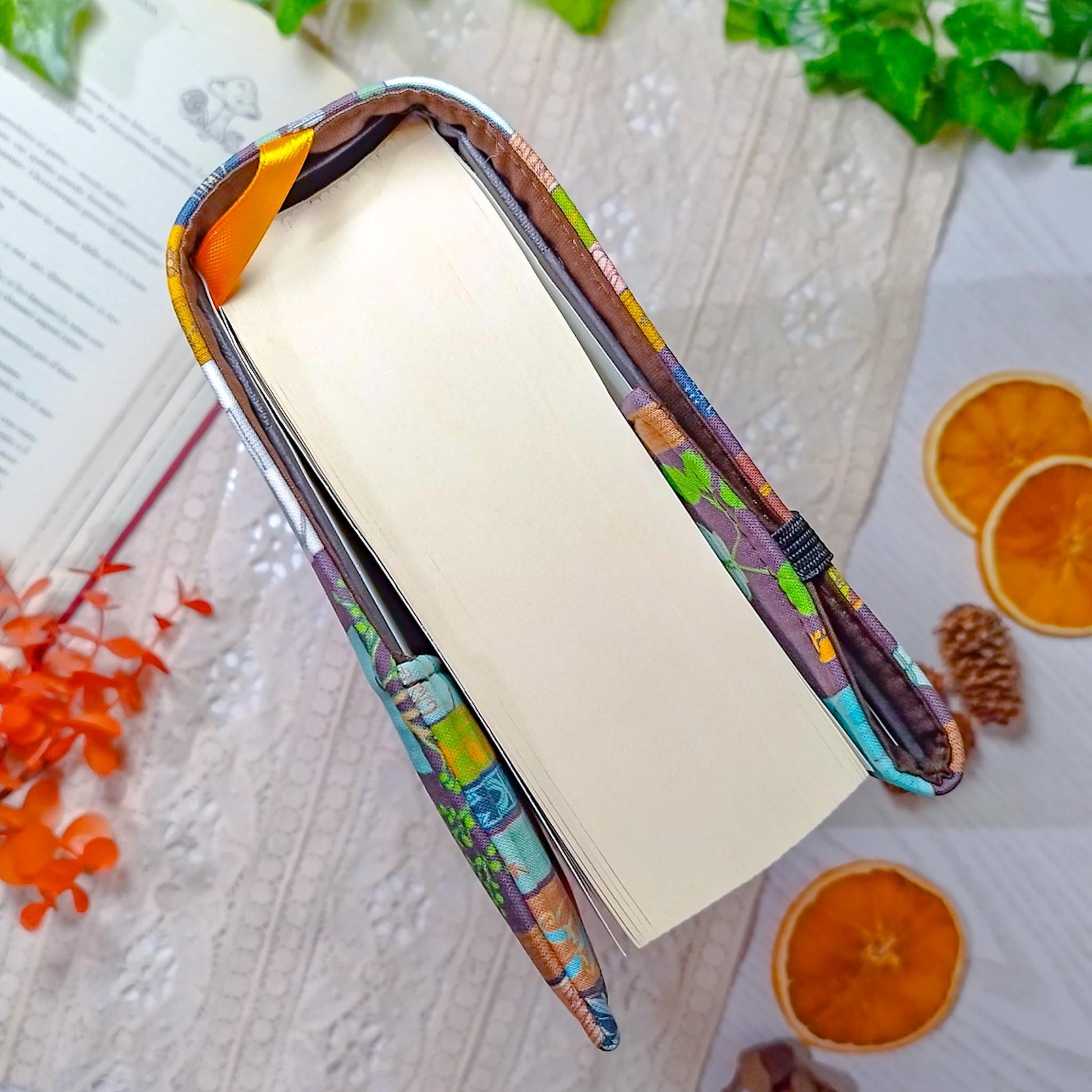 La parte destra della custodia è aperta e avvolge la copertina del libro per adattarsi al numero di pagine. Ribaltando l'elastico al di fuori della copertina, la custodia si mantiene salda al libro anche mentre leggi.
