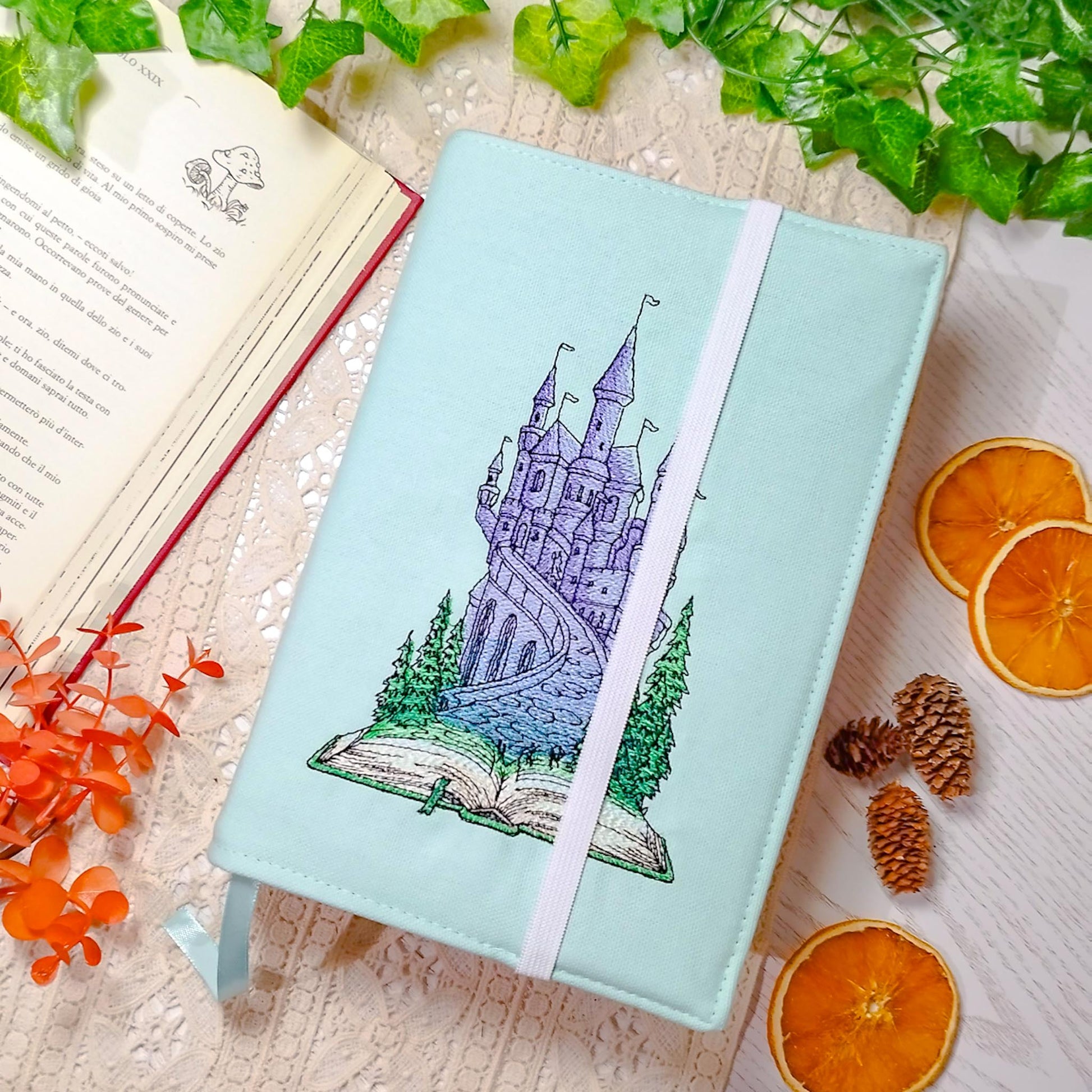 Book cover ricamata "Castello sul libro" | Custodia per libri regolabile