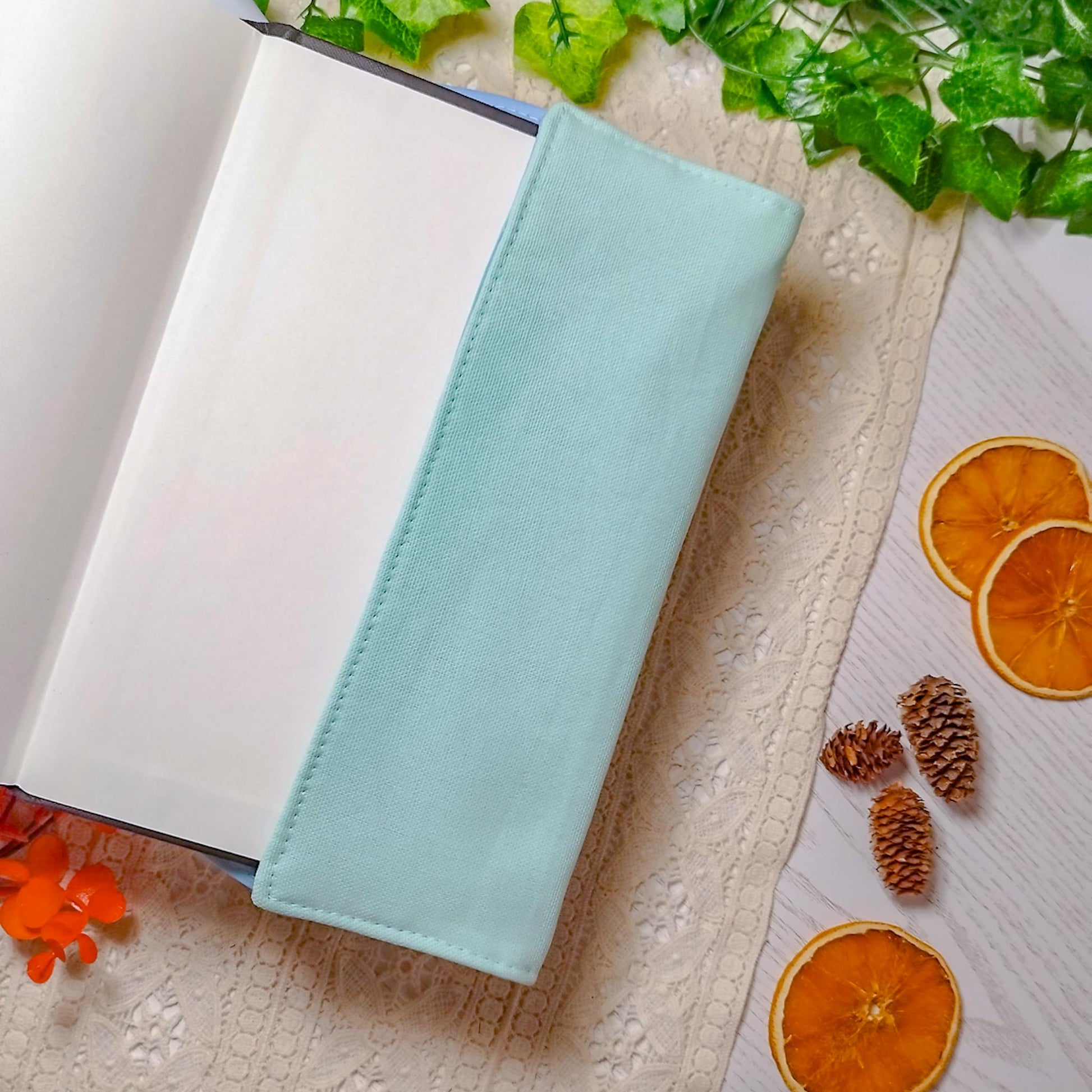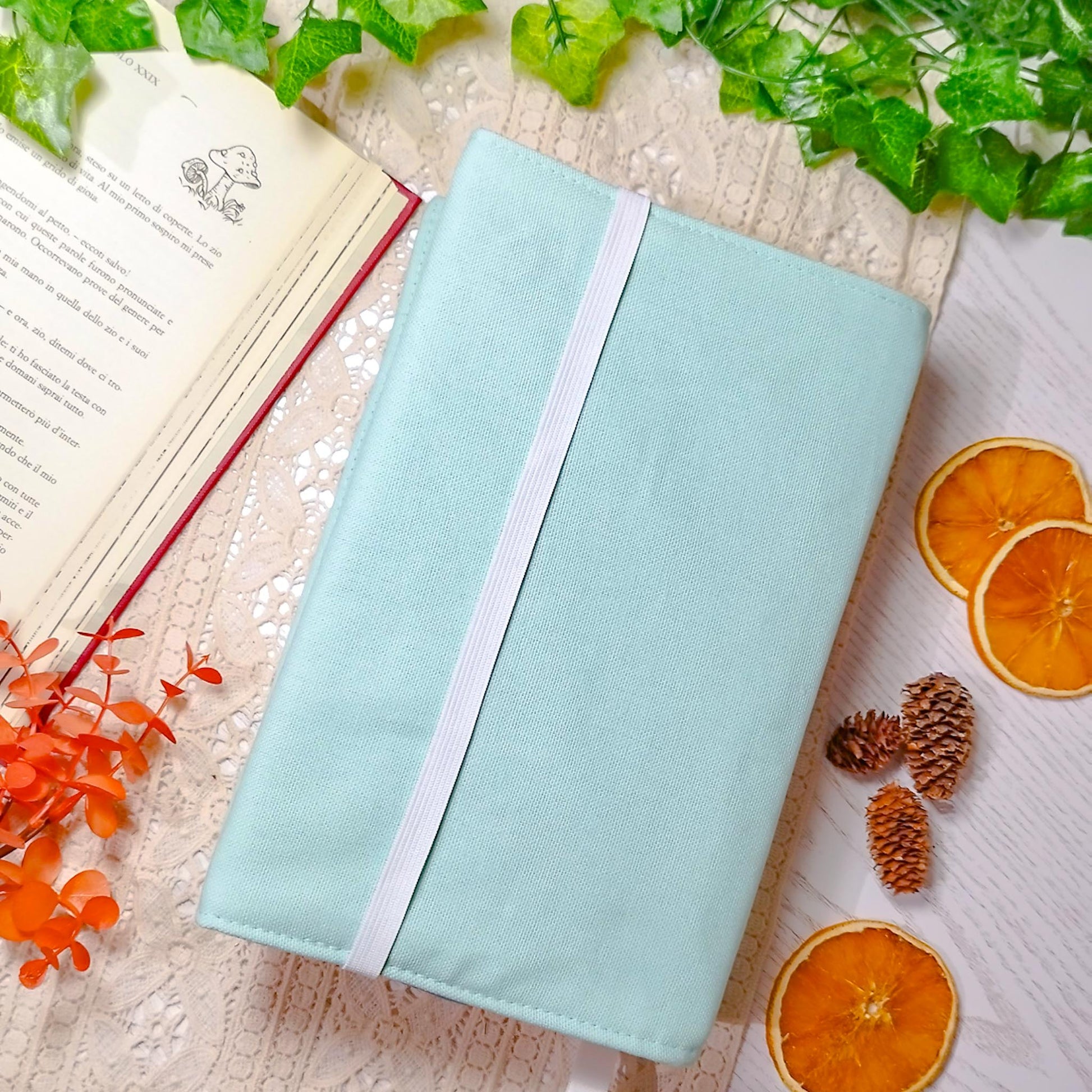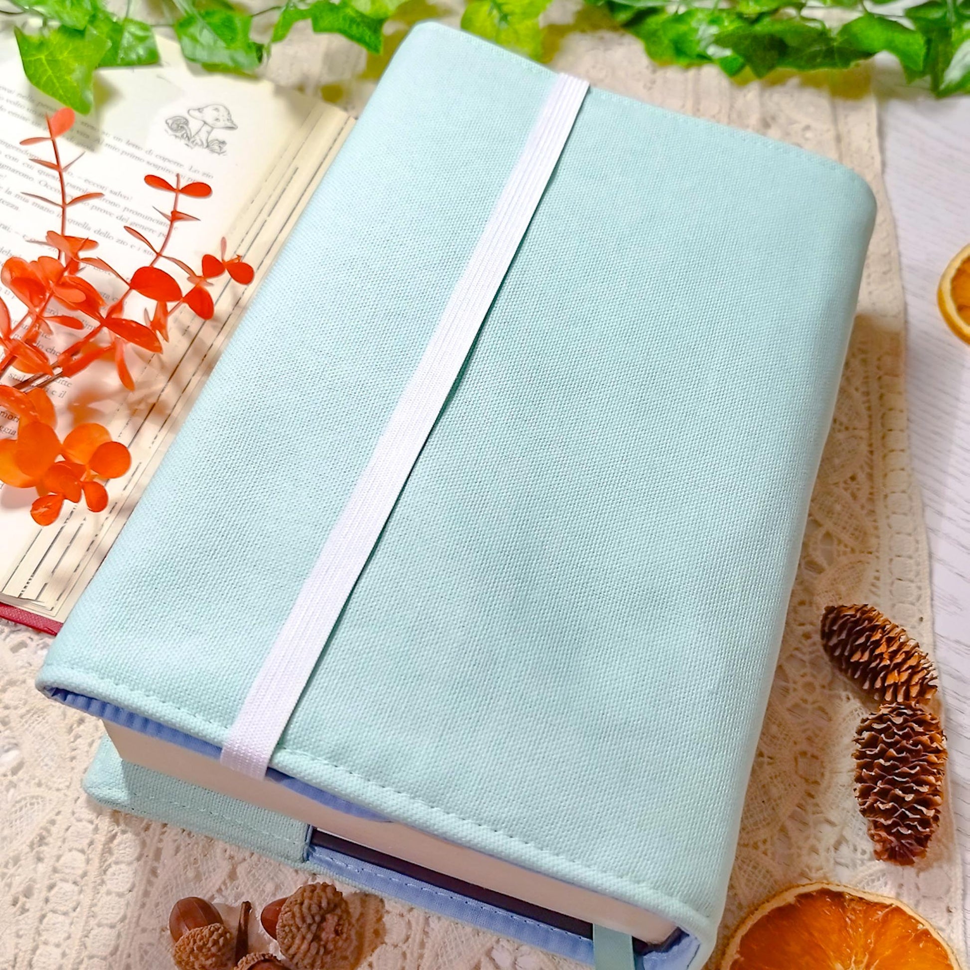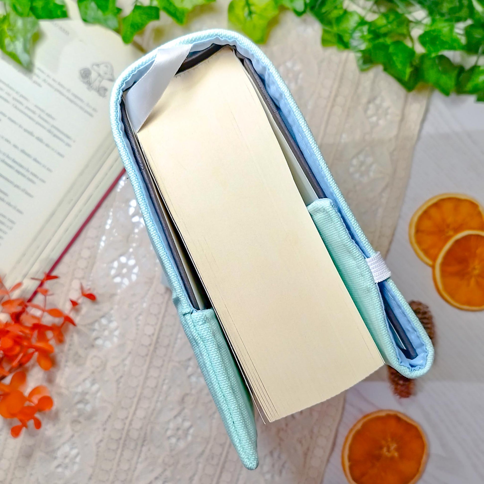 La parte destra della custodia è aperta e avvolge la copertina del libro per adattarsi al numero di pagine. Ribaltando l'elastico al di fuori della copertina, la custodia si mantiene salda al libro anche mentre leggi.