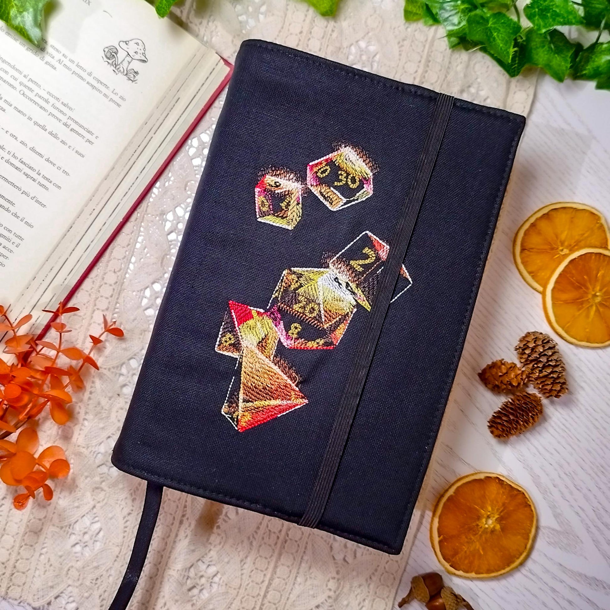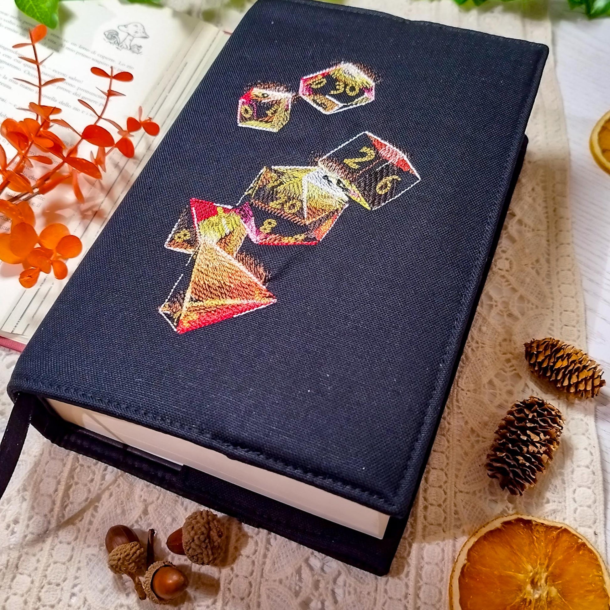 Book cover ricamata "Dadi iridescenti" | Custodia per libri regolabile