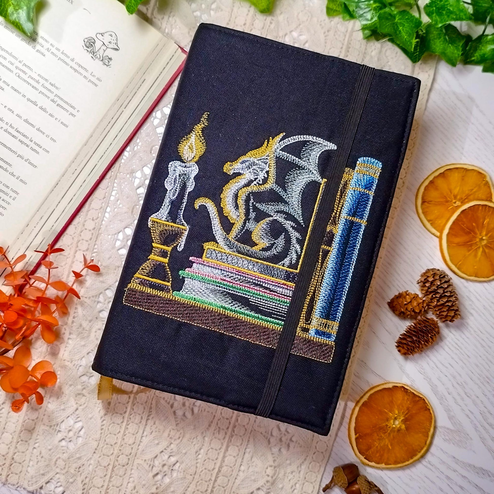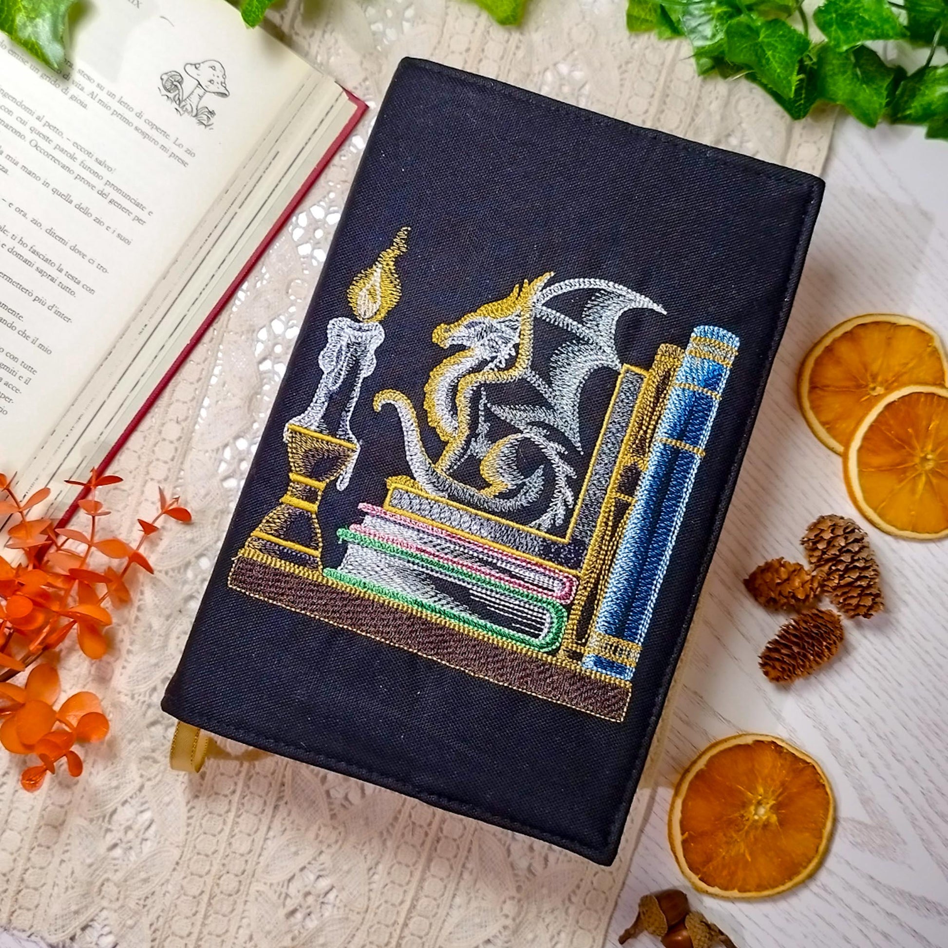 Le book cover ricamate nascono proprio per questo: piccole armature soffici, realizzate artigianalmente, che avvolgono il tuo libro come una coperta incantata. Ogni ricamo a macchina è un frammento di fantasia, con creature e simboli ispirati ai mondi che ami e che trasformano la tua lettura in un viaggio ancora più speciale.