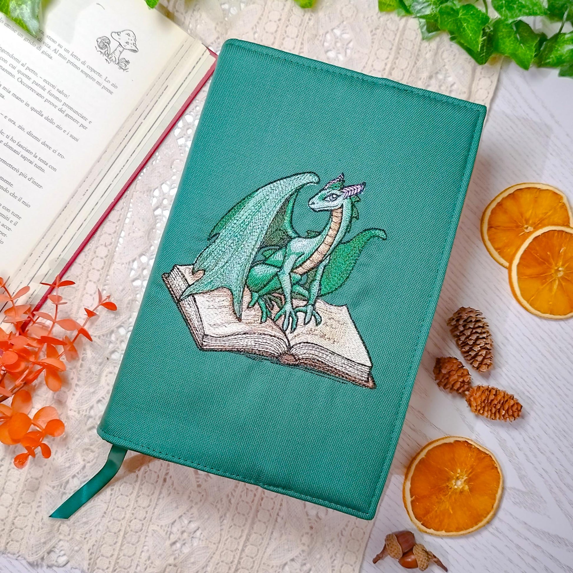 Book cover ricamata "Drago sul libro" | Custodia per libri regolabile