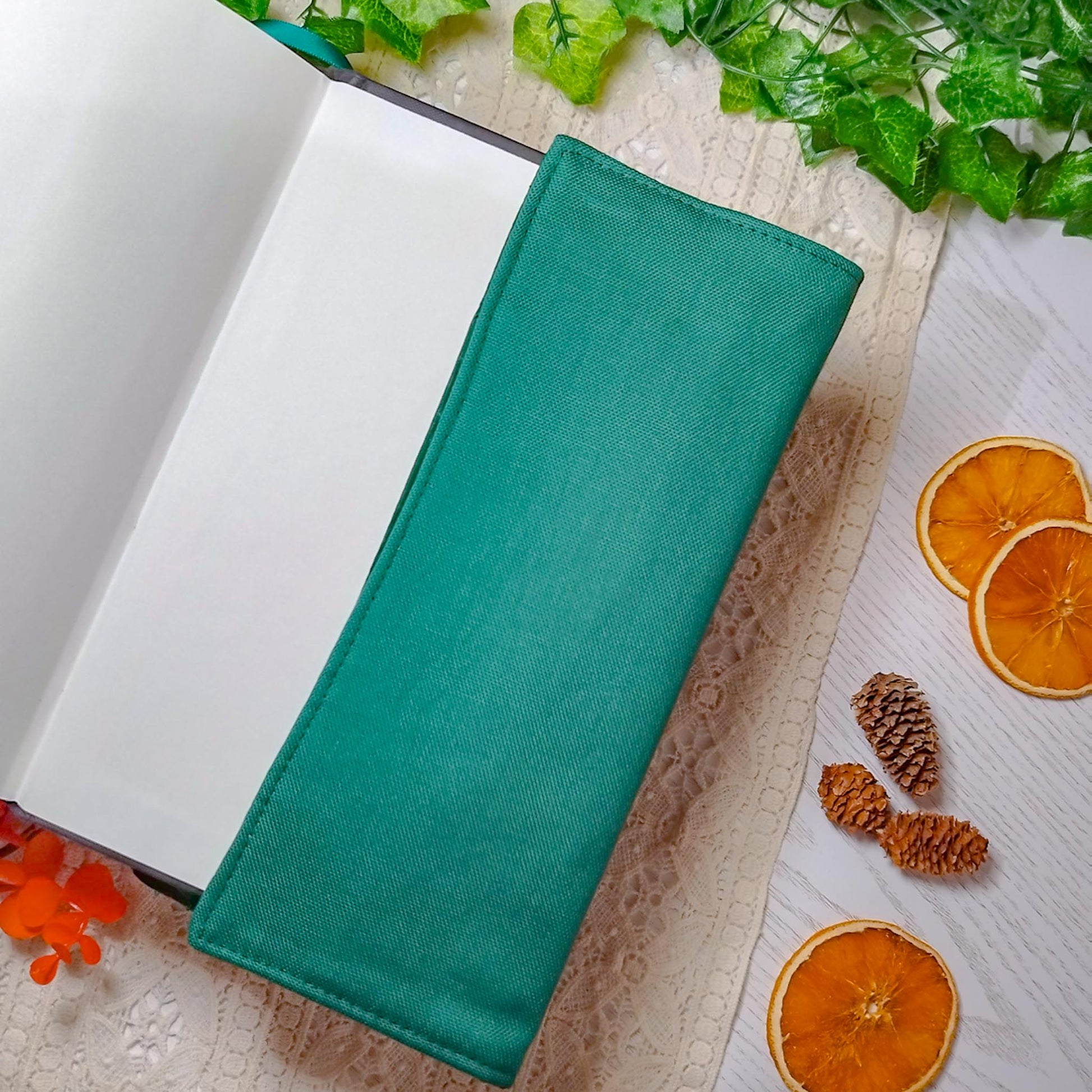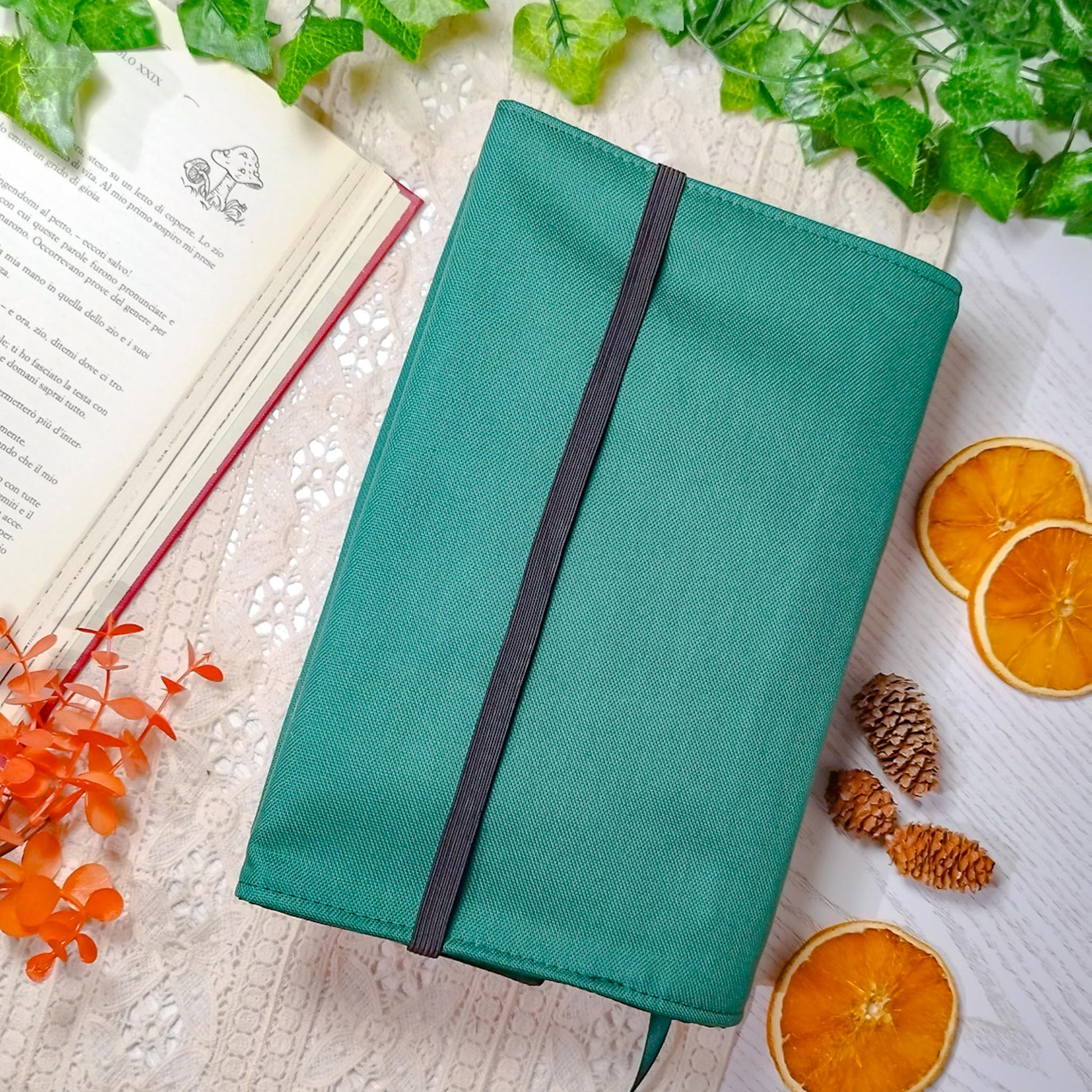 Book cover, custodia per libri e porta agenda per proteggere libri, agende e quaderni, artigianale realizzata in Italia. Si adatta alla larghezza e alla profondità del libro. Con segnalibro di colore verde.