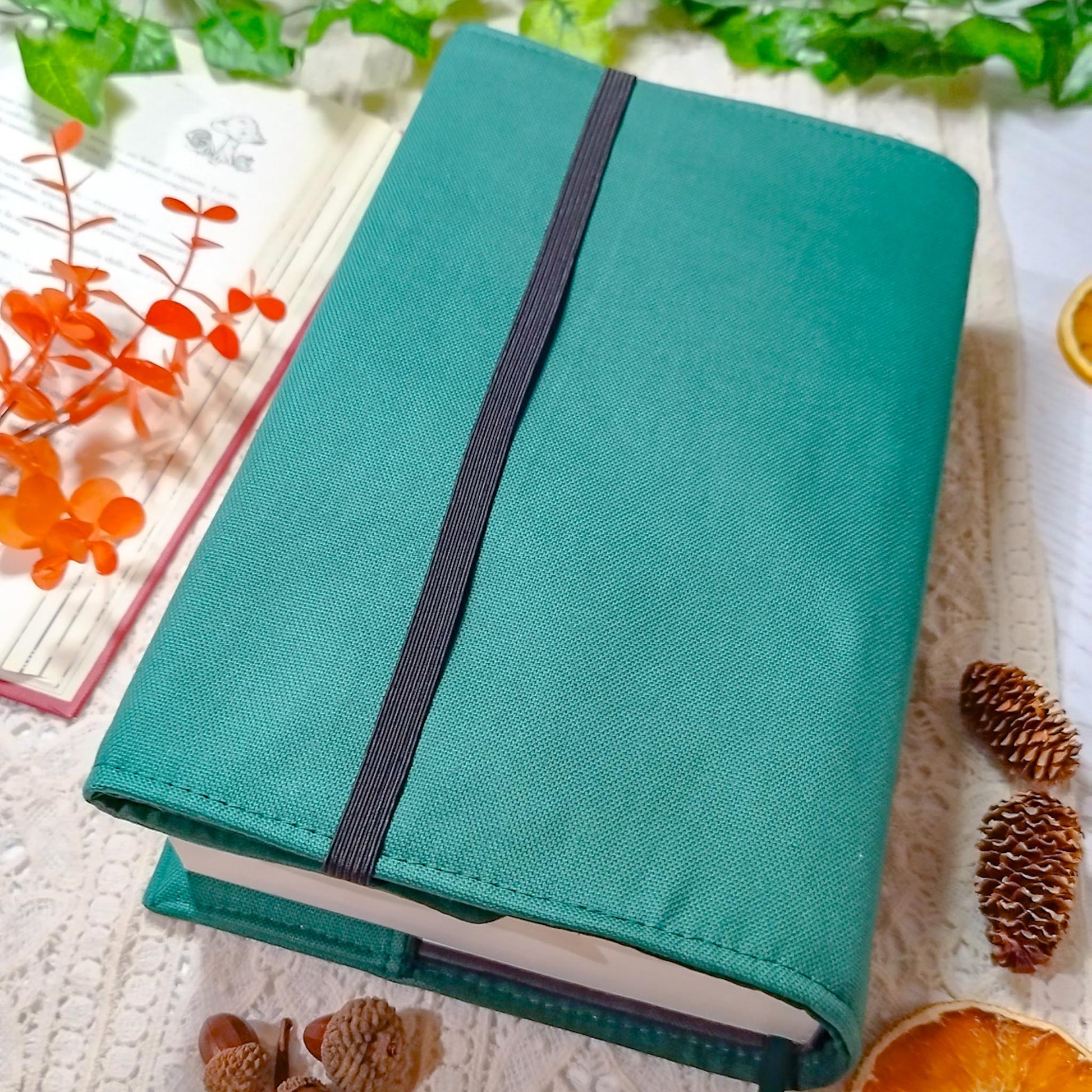 La parte destra della custodia è aperta e avvolge la copertina del libro per adattarsi al numero di pagine. Ribaltando l'elastico al di fuori della copertina, la custodia si mantiene salda al libro anche mentre leggi.