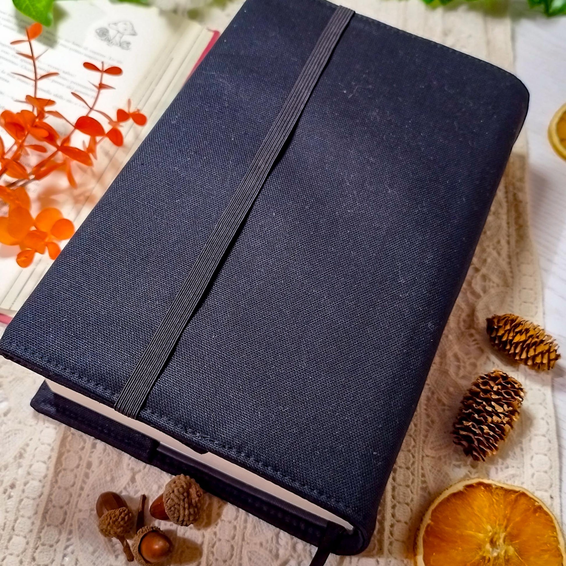 La parte destra della custodia è aperta e avvolge la copertina del libro per adattarsi al numero di pagine. Ribaltando l'elastico al di fuori della copertina, la custodia si mantiene salda al libro anche mentre leggi.