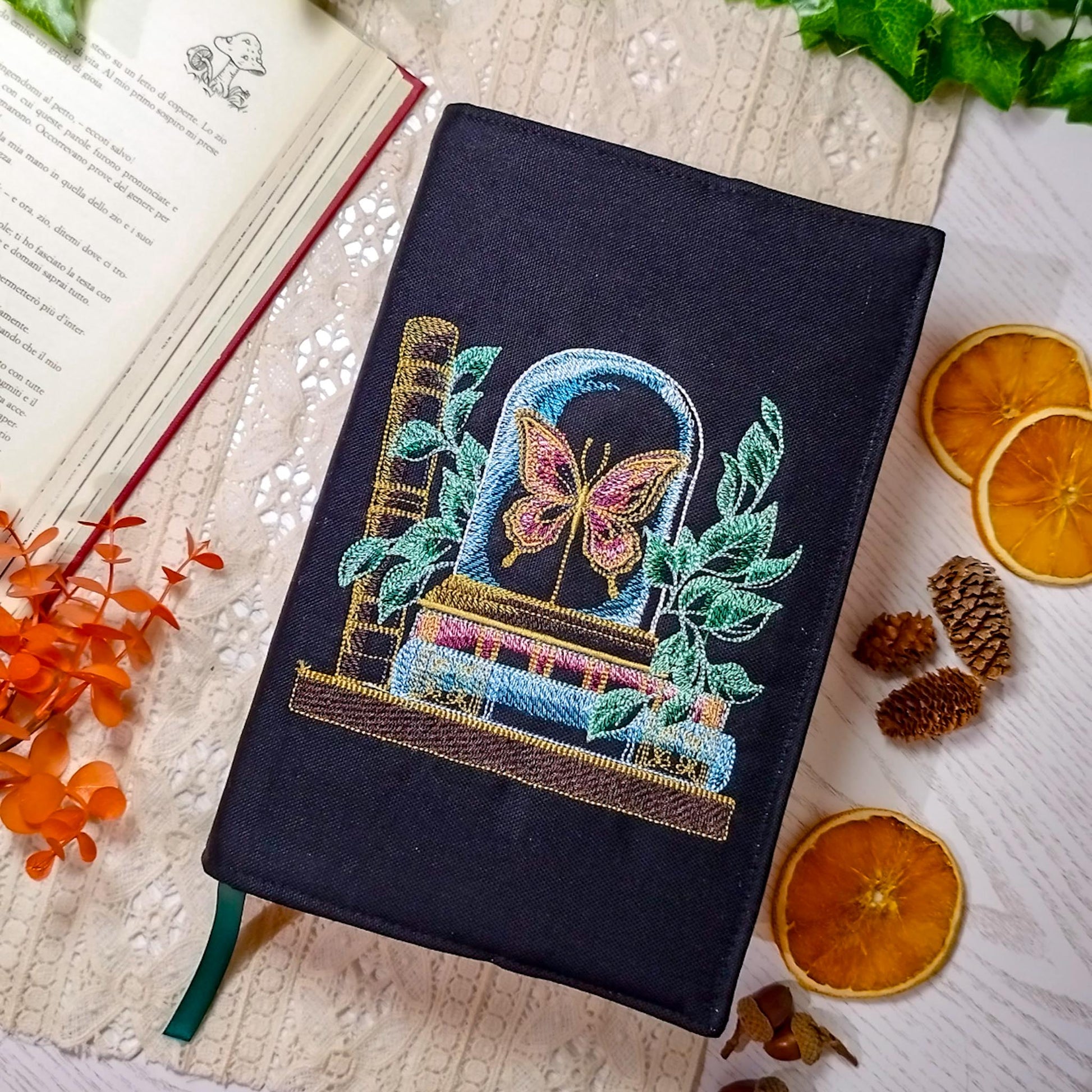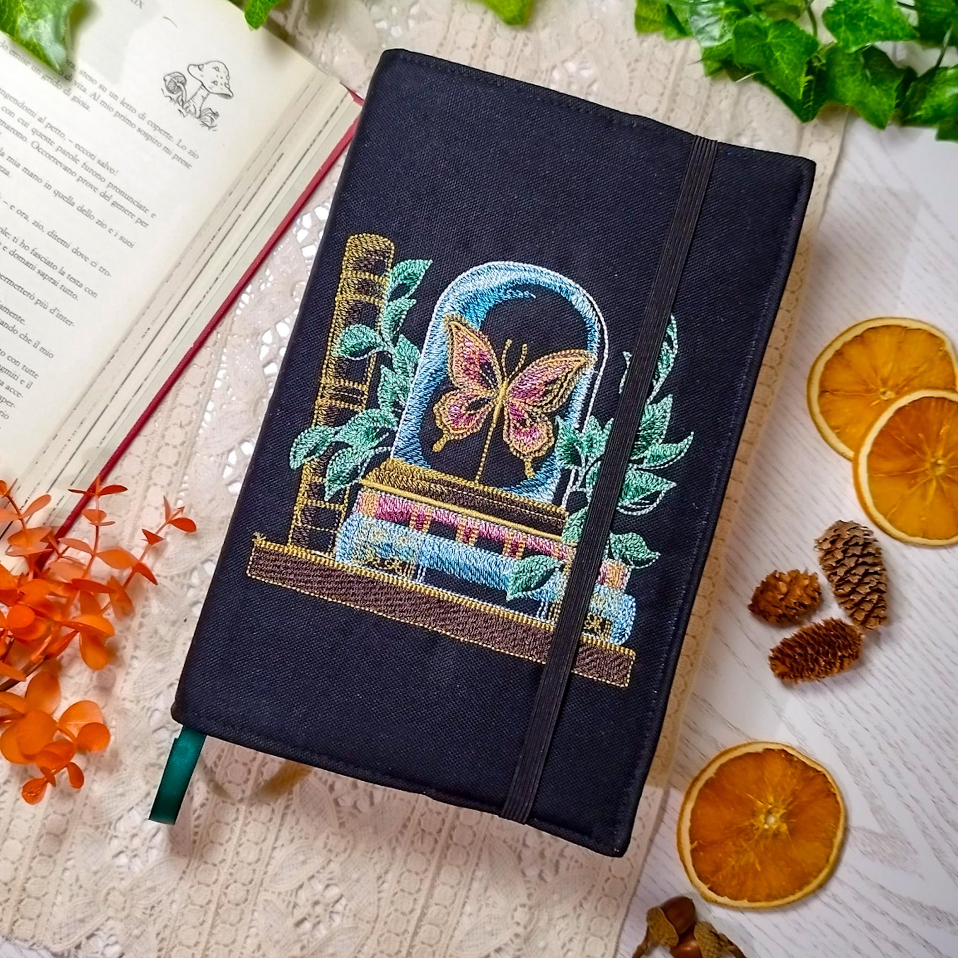 Book cover ricamata "Farfalla sulla libreria" | Custodia per libri regolabile