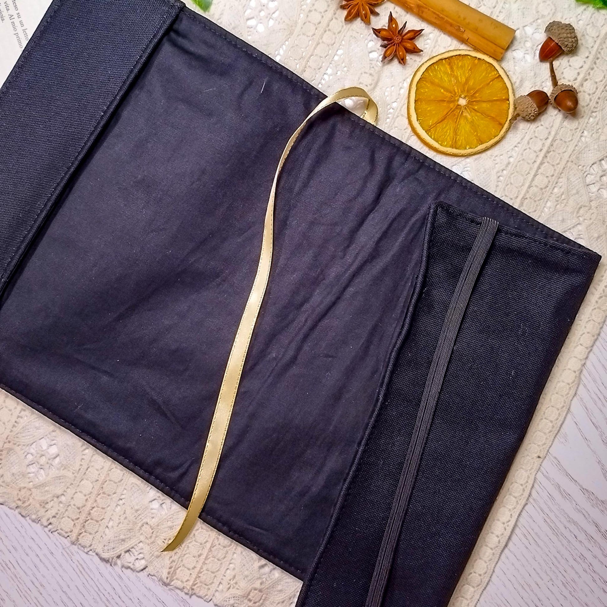 La parte destra della custodia è aperta e avvolge la copertina del libro per adattarsi al numero di pagine. Ribaltando l'elastico al di fuori della copertina, la custodia si mantiene salda al libro anche mentre leggi.