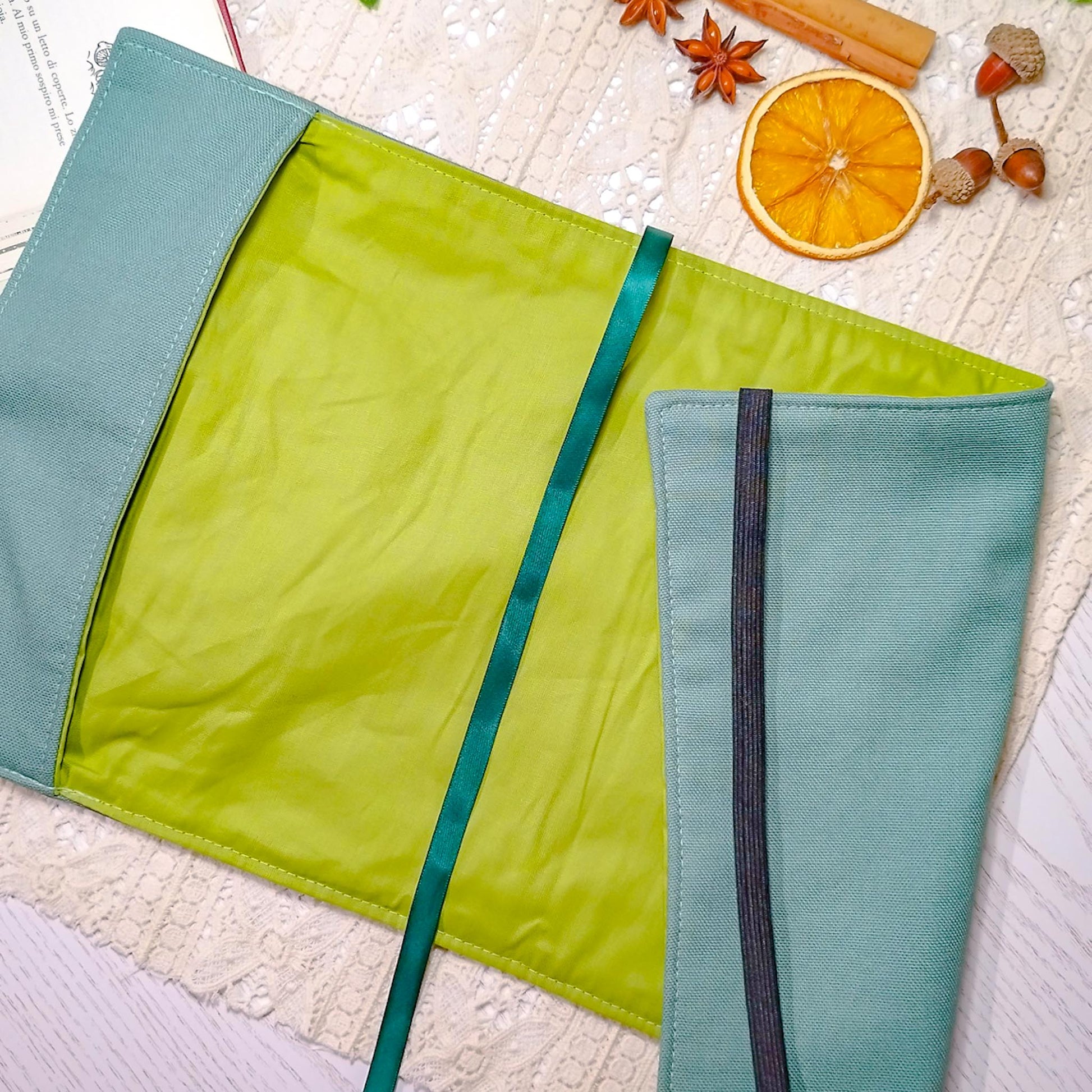 Book cover, custodia per libri e porta agenda per proteggere libri, agende e quaderni, artigianale realizzata in Italia. Si adatta alla larghezza e alla profondità del libro. Con segnalibro di colore verde.