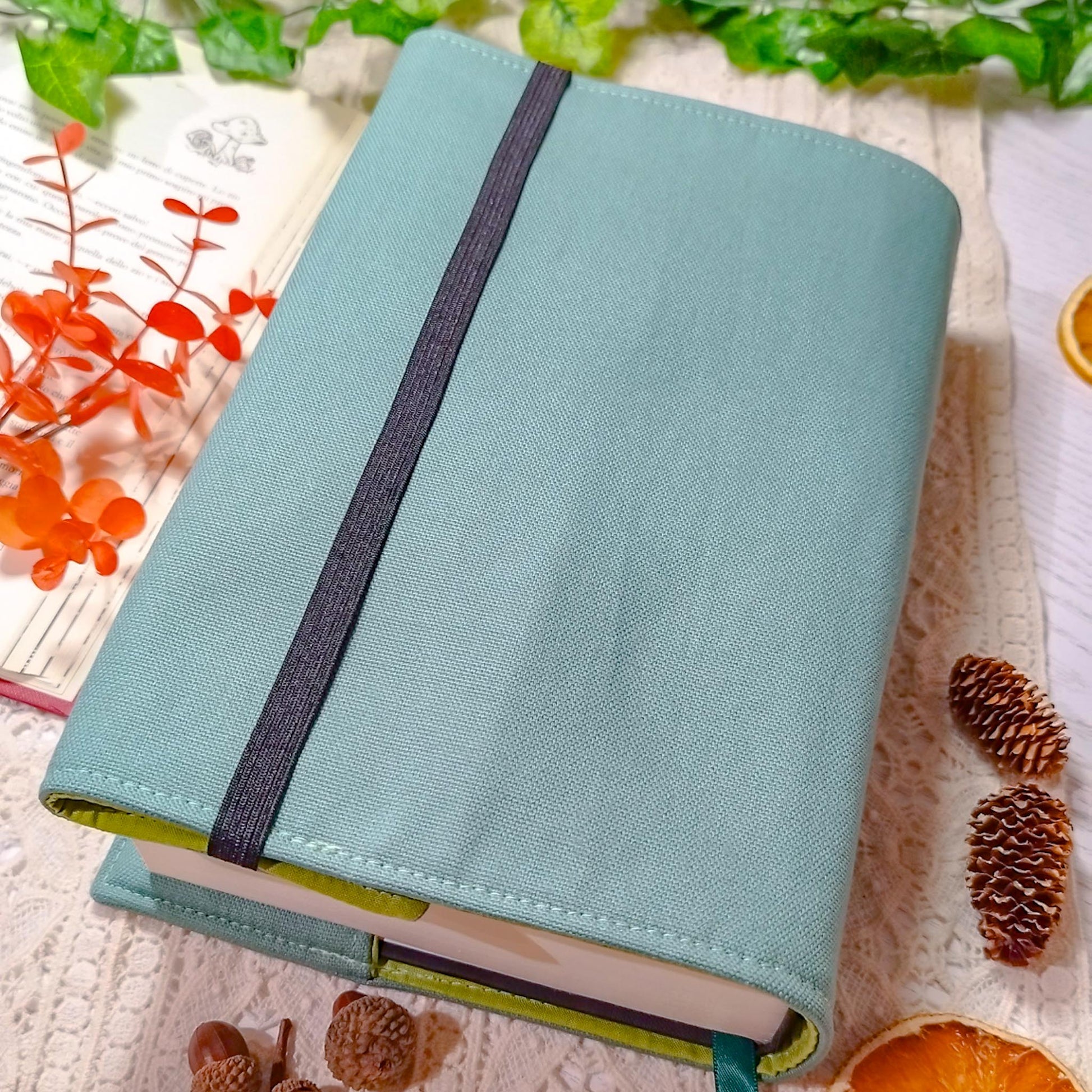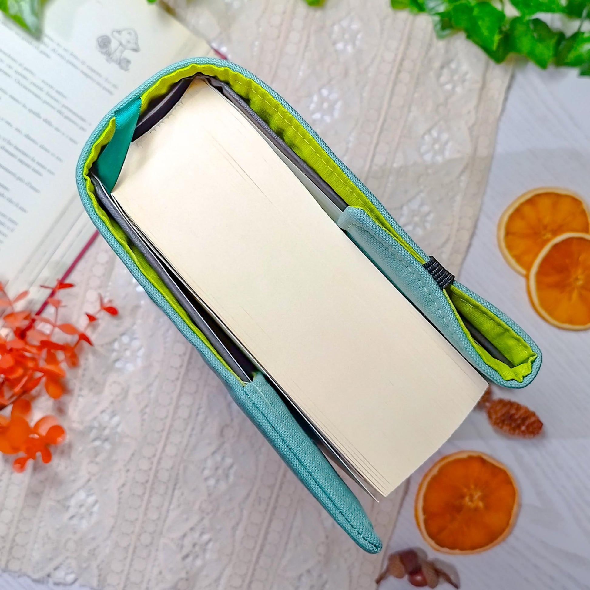La parte destra della custodia è aperta e avvolge la copertina del libro per adattarsi al numero di pagine. Ribaltando l'elastico al di fuori della copertina, la custodia si mantiene salda al libro anche mentre leggi.