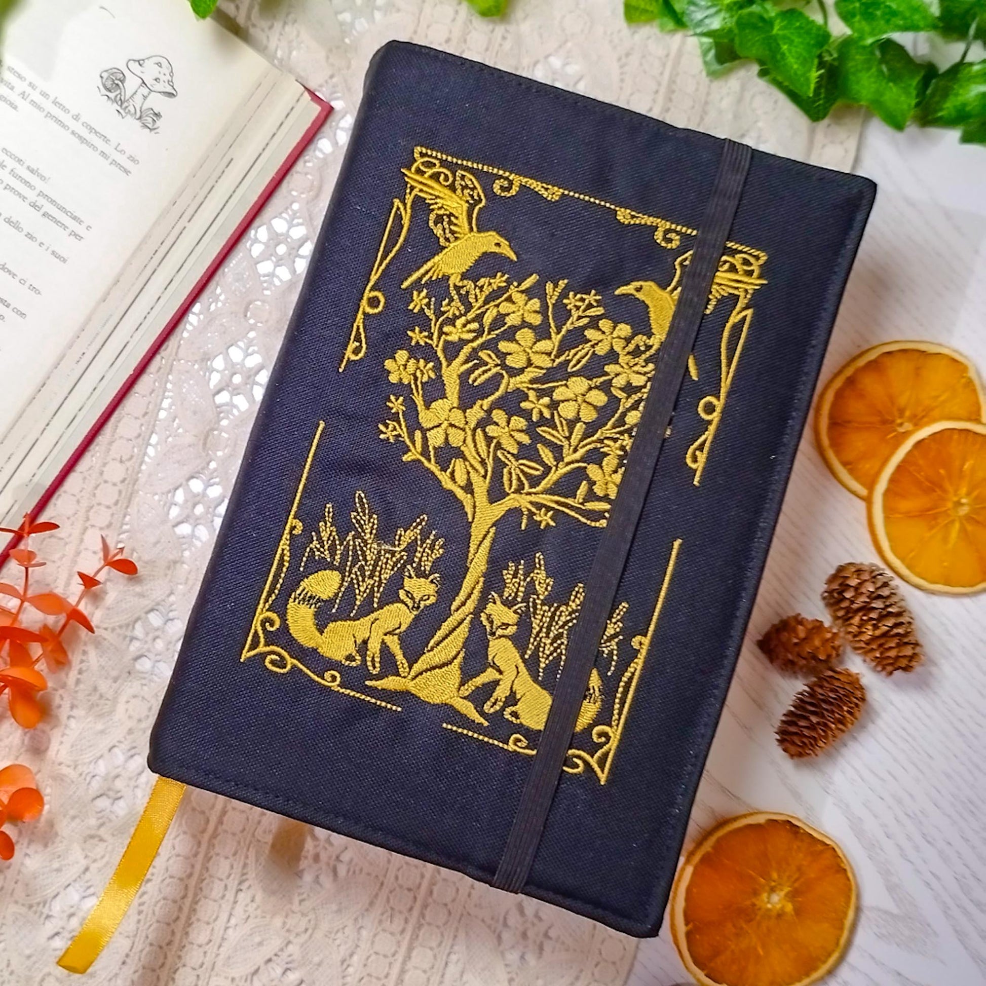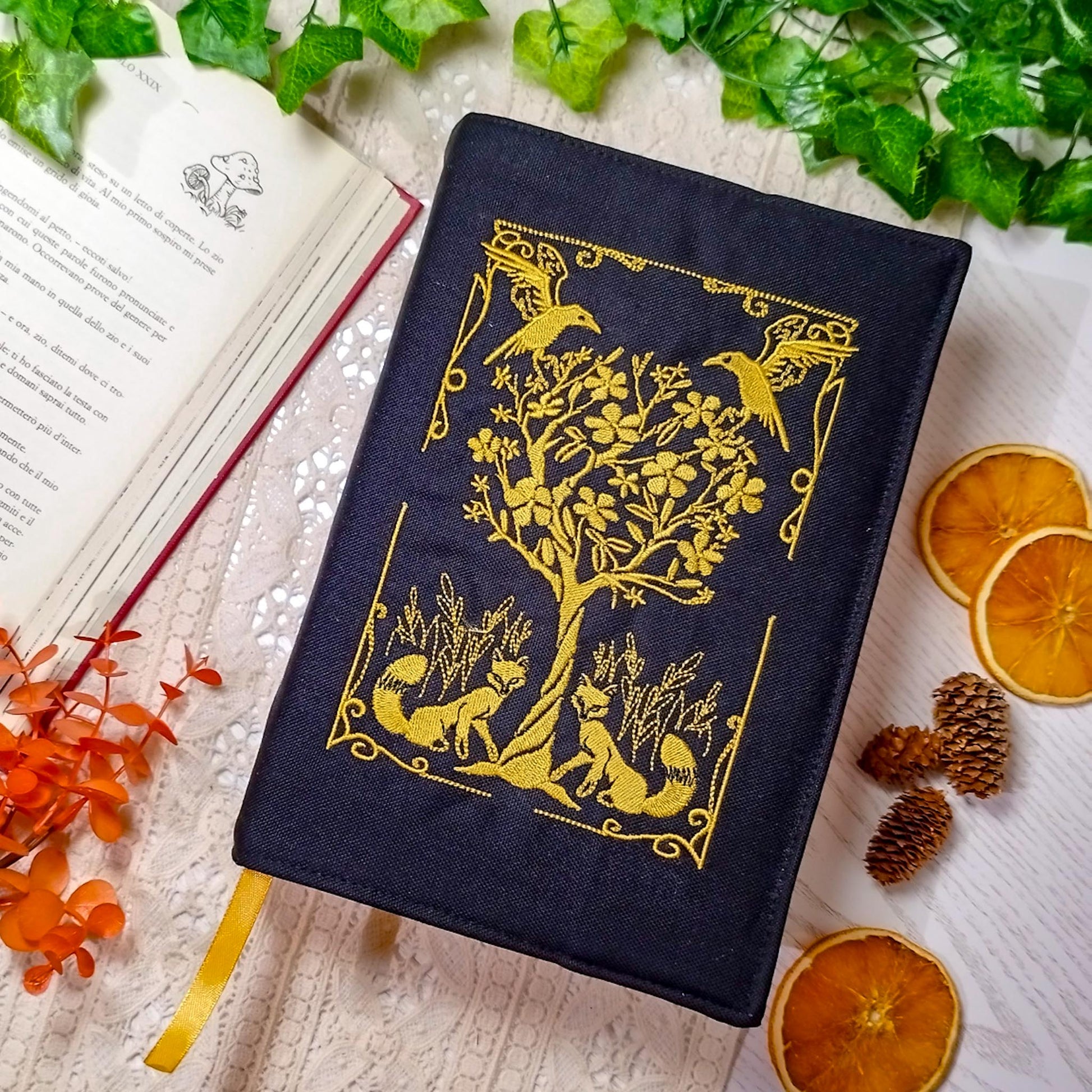 Book cover ricamata "Volpi e corvi" | Custodia per libri regolabile