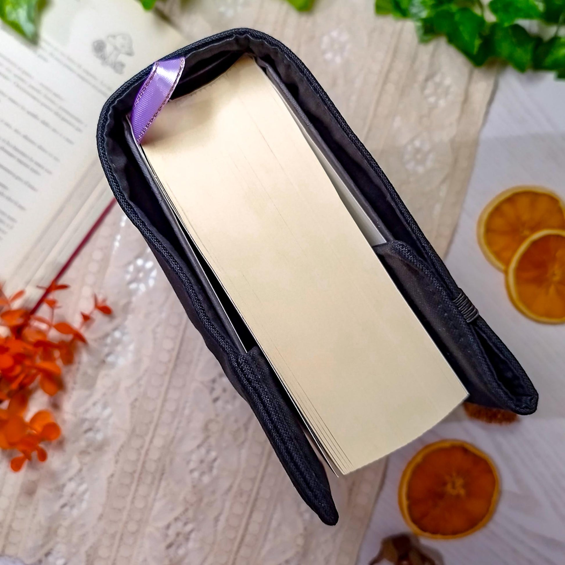 La parte destra della custodia è aperta e avvolge la copertina del libro per adattarsi al numero di pagine. Ribaltando l'elastico al di fuori della copertina, la custodia si mantiene salda al libro anche mentre leggi.