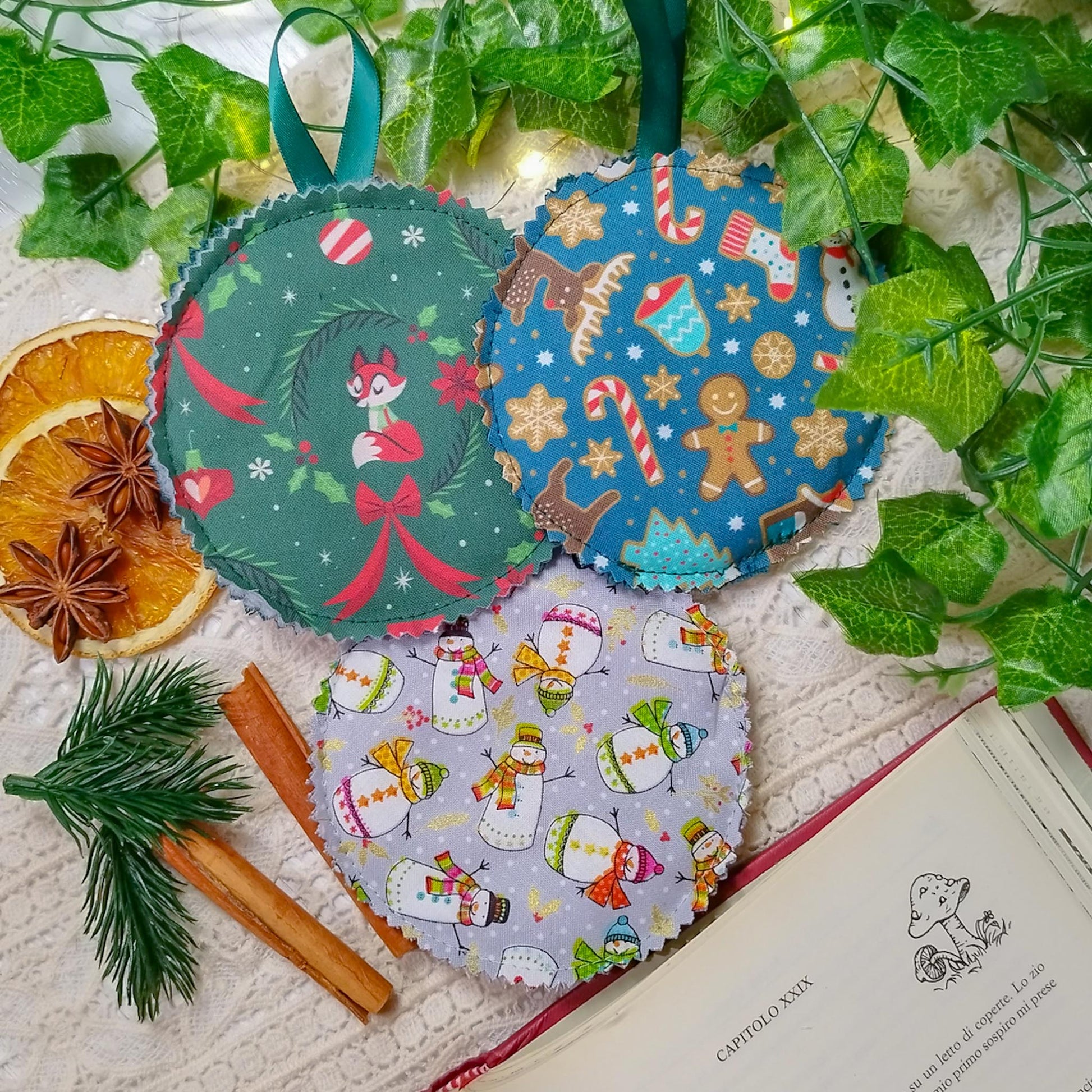 Ogni decorazione è morbida e leggermente imbottita, pensata per essere leggera, resistente e piacevole al tatto. Da un lato trovi una stampa a tema Natale: simboli, piccoli incanti e dettagli che ricordano il mondo delle storie. Dall’altro, il cotone in tinta unita.